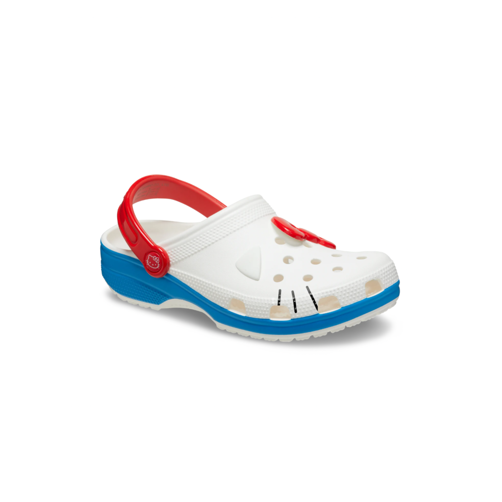 • Official Hello Kitty × Crocs collaboration — featuring a white base with Hello Kitty’s signature red bow and matching red heel strap.